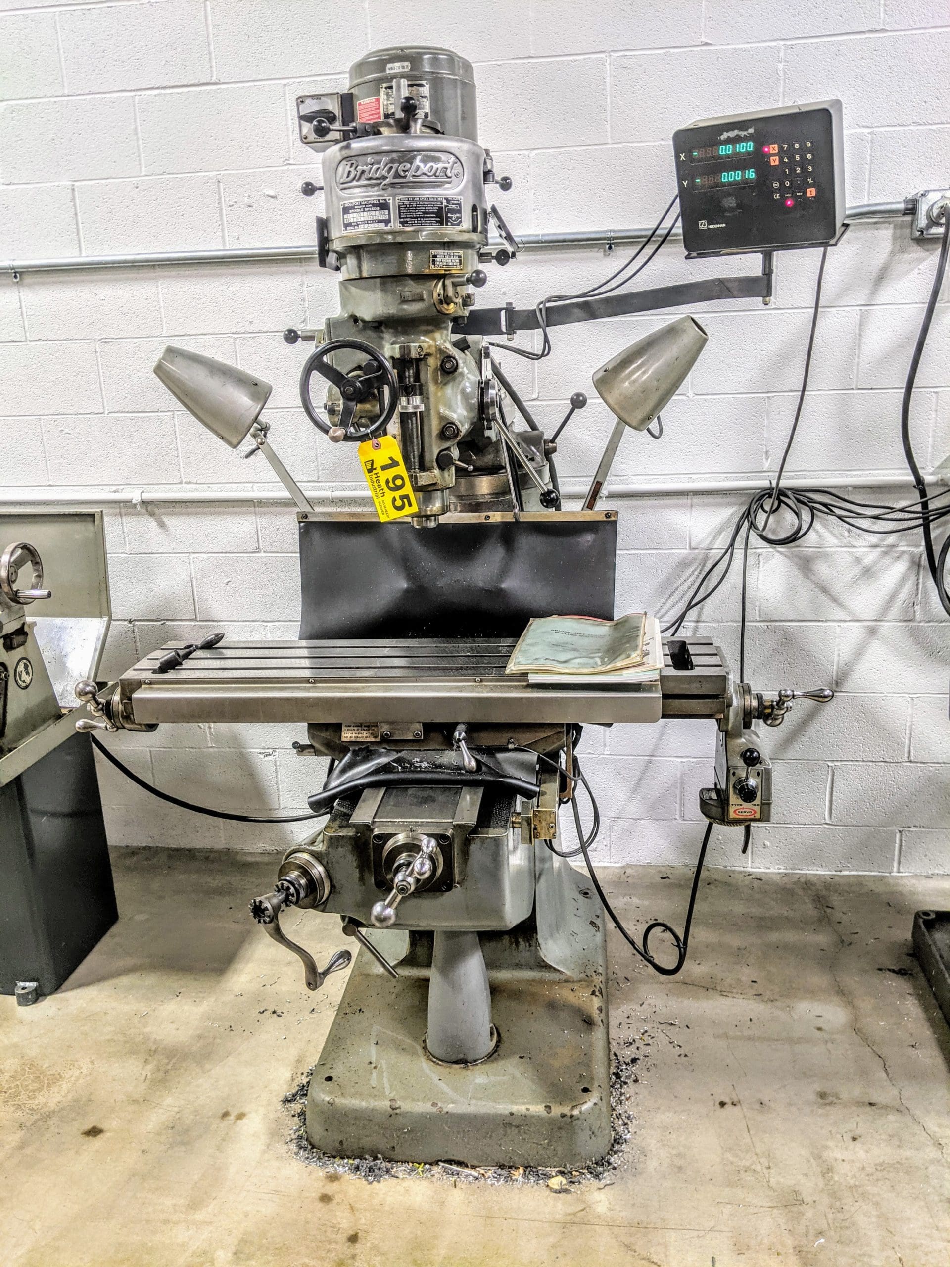 Bridgeport 1 HP “J-Head” Ram Type Vertical Mill, s/n 12BR199677, 42” Power Feed Table, Heidenhain DRO